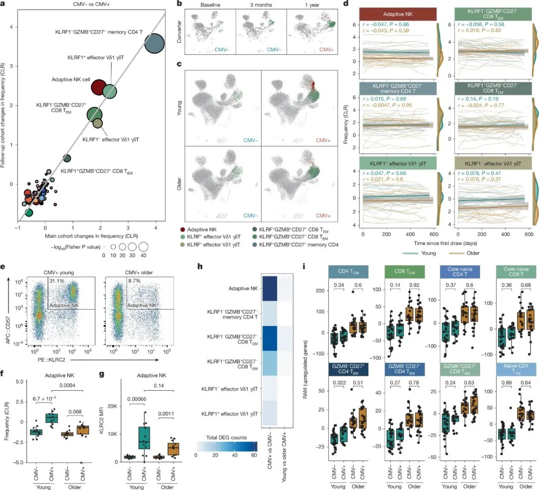 即使感染CMV,老年人的T细胞RAM仍与未感染者一致——说明CMV改变的是免疫细胞的数量与组成,而非年龄相关的功能状态。