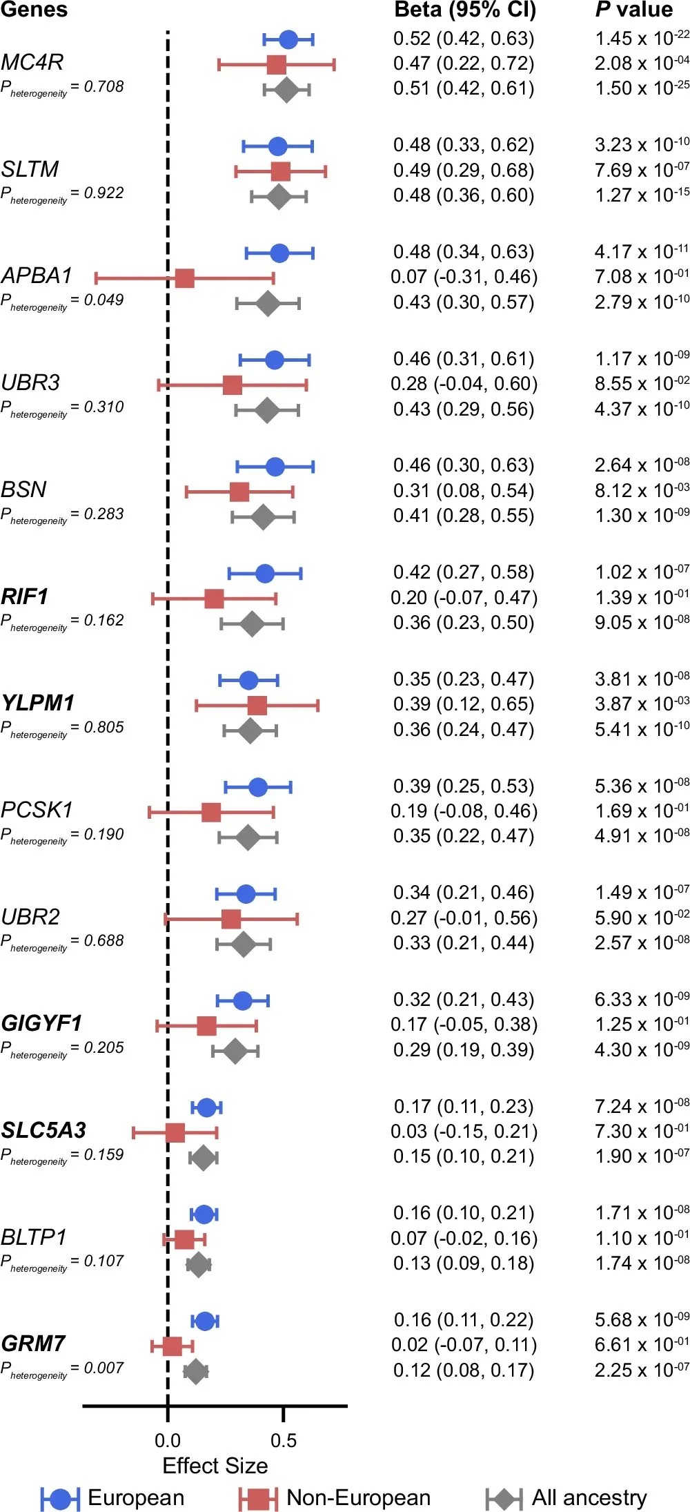 YLPM1、MC4R和SLTM三种基因在欧裔与非欧裔人群中效应一致,尤以YLPM1最为显著,其携带者的严重肥胖风险(BMI≥40)增加约3倍。相比之下,GRM7和APBA1等基因呈现显著的祖先异质性,在非欧裔人群中效应减弱,提示遗传背景与环境因素可能交互影响基因外显率。