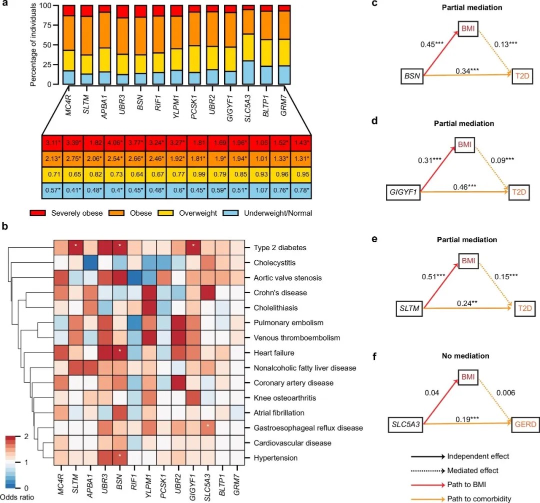 新发现基因多高表达于大脑及脂肪组织,尤其YLPM1与精神障碍(如意识状态改变)显著相关,凸显其通过神经调控参与肥胖的多效性。结构方程模型进一步揭示,GIGYF1和SLTM不仅直接增加2型糖尿病风险,还通过BMI作为部分中介因子放大共病效应。