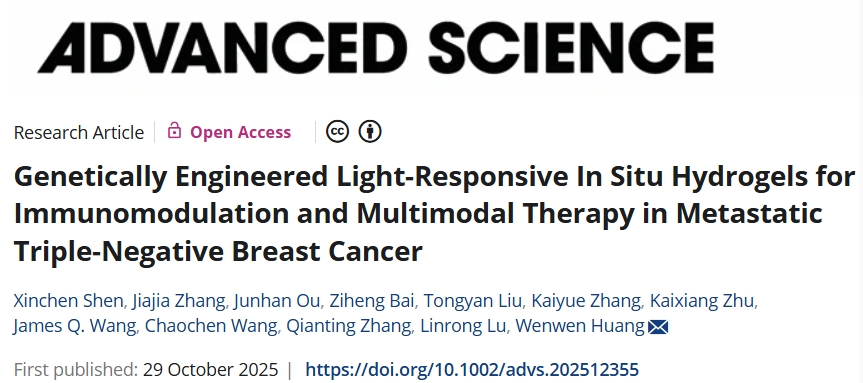 近日,浙江大学爱丁堡大学联合学院研究团队在期刊《Advanced Science》上发表了研究论文,题为“Genetically Engineered Light-Responsive In Situ Hydrogels for Immunomodulation and Multimodal Therapy in Metastatic Triple-Negative Breast Cancer”,本研究通过促进免疫原性细胞死亡和刺激免疫激活,将免疫抑制的“冷”肿瘤转化为免疫活性的“热”肿瘤。开发的cSELP 水凝胶系统对原发性和转移性 TNBC 均显示出强大的治疗效果,同时保持了出色的生物相容性和长期安全性。这种蛋白质材料平台提供了一种创新策略,能够重塑肿瘤微环境,并将多种治疗方式整合到一个单一的生物相容性系统中,突显了其在临床转化方面的潜力。