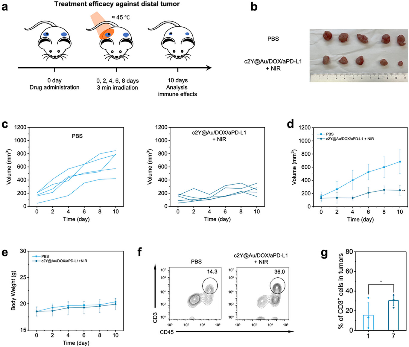 研究人员研究了基于 cSELP 的 SPTCI 策略抑制远处肿瘤生长的潜力。将小鼠双侧侧腹植入两个肿瘤,待远处肿瘤生长至约 100 立方毫米时,对原发肿瘤进行局部治疗。设计了两组治疗方案,包括 PBS 组和 c2Y@Au/DOX/aPD-L1 + NIR 组。远处肿瘤的大小变化显示,c2Y@Au/DOX/aPD-L1 + NIR 组的生长速度减缓,在第 10 天实现了 63.5%的抑制。治疗耐受性良好,两组小鼠体重差异极小。通过分析远处肿瘤中的肿瘤浸润淋巴细胞(TIL)群体,发现 c2Y@Au/DOX/aPD-L1 + NIR 组中 CD3+ T 细胞的比例显著更高,表明远处肿瘤的免疫抑制肿瘤微环境得到了缓解。与 PBS 组相比,c2Y@Au/DOX/aPD-L1 + NIR 组远处肿瘤中的 CD45+CD3+CD8+ T 细胞数量增加了约 5 倍。在脾脏中,接受 c2Y@Au/DOX/aPD-L1 + 近红外光治疗的小鼠表现出 CD8+ 和 CD4+ T 细胞数量增加,进一步证明了其能够激活全身性免疫反应,从而抑制远处肿瘤的生长。这些结果表明,基于 cSELP 的 SPTCI 策略能够通过激活全身性免疫反应同时治疗远处肿瘤,同时保持全身耐受性,并有效抑制原位肿瘤的生长。