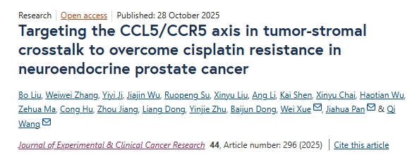 近日,上海交通大学医学院附属仁济医院研究人员在期刊《Journal of Experimental & Clinical Cancer Research》上发表了研究论文,题为“Targeting the CCL5/CCR5 axis in tumor-stromal crosstalk to overcome cisplatin resistance in neuroendocrine prostate cancer”,本研究中,研究人员发现了一种由 CCL5/CCR5 轴介导的肿瘤基质相互作用,这种相互作用驱动了神经内分泌前列腺癌(NEPC)对顺铂的耐药性。顺铂诱导的 DNA 损伤会促进癌相关成纤维细胞(CAFs)中 cGAS-STING 依赖性的衰老程序,从而导致 CCL5 的分泌,CCL5 是一种关键的衰老相关分泌表型因子。来自 CAFs 的 CCL5 与肿瘤细胞上的 CCR5 结合,促进 CCR5/β-arrestin1/p85 复合物的形成,从而激活 PI3K/AKT 通路。这种激活增强了 DNA 修复,保护肿瘤细胞免受顺铂诱导的细胞凋亡。使用 FDA 批准的 CCR5 拮抗剂马拉维诺对 CCL5/CCR5 通路进行药理学抑制,可使 NEPC 细胞对顺铂治疗敏感,并显著延长 NEPC 小鼠模型的生存期。