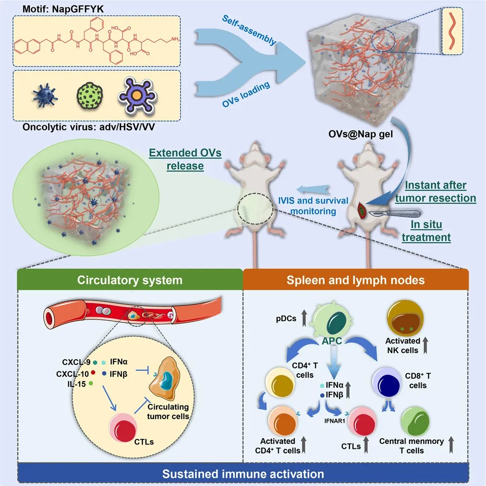 肿瘤切除手术后复发一直是癌症治疗领域的重大挑战。近日,南京大学医学院附属鼓楼医院(论文署名单位)顾晓松院士/江春平教授/吴俊华教授团队等在《Cell Reports Medicine》发表突破性研究成果,首次证实通过新型超分子水凝胶载体在肿瘤切除后立即局部释放溶瘤病毒,可即时激活全身性I型干扰素免疫通路,在小鼠模型中实现术后肿瘤复发率降低90%以上,并显著延长生存期。这项创新疗法为破解癌症术后复发这一世界性难题提供了全新范式。