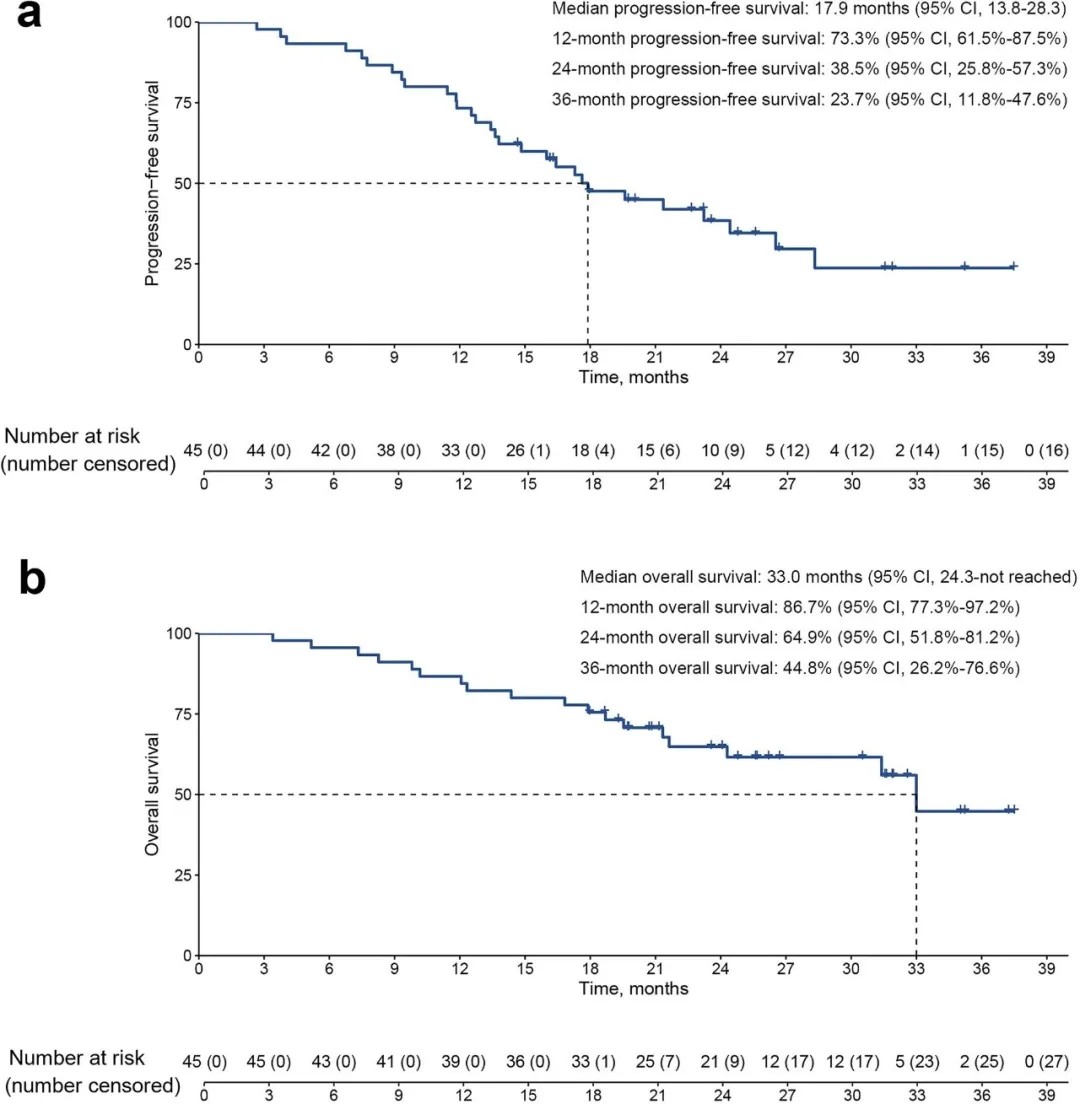生存期大幅延长:中位PFS 17.9个月(1年PFS率73.3%),中位OS 33.0个月(1年OS率86.7%,3年OS率44.8%),显著优于历史对照的26个月中位生存期。