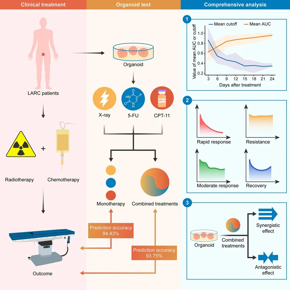 类器官是一种三维细胞培养模型,能够高度还原原始肿瘤的组织结构、细胞组成和功能特性。近年来,患者来源的癌症类器官(PDCOs)因其能够忠实反映患者对治疗的反应而备受关注。此前的研究表明,类器官对单一治疗的反应可以预测患者的临床结局,但对于局部晚期直肠癌(LARC)患者接受的综合新辅助同步放化疗,其预测价值尚未充分探索。本研究旨在通过建立大规模直肠癌类器官生物库,系统评估类器官对单药治疗及联合放化疗的反应,并验证其对临床结局的预测能力。