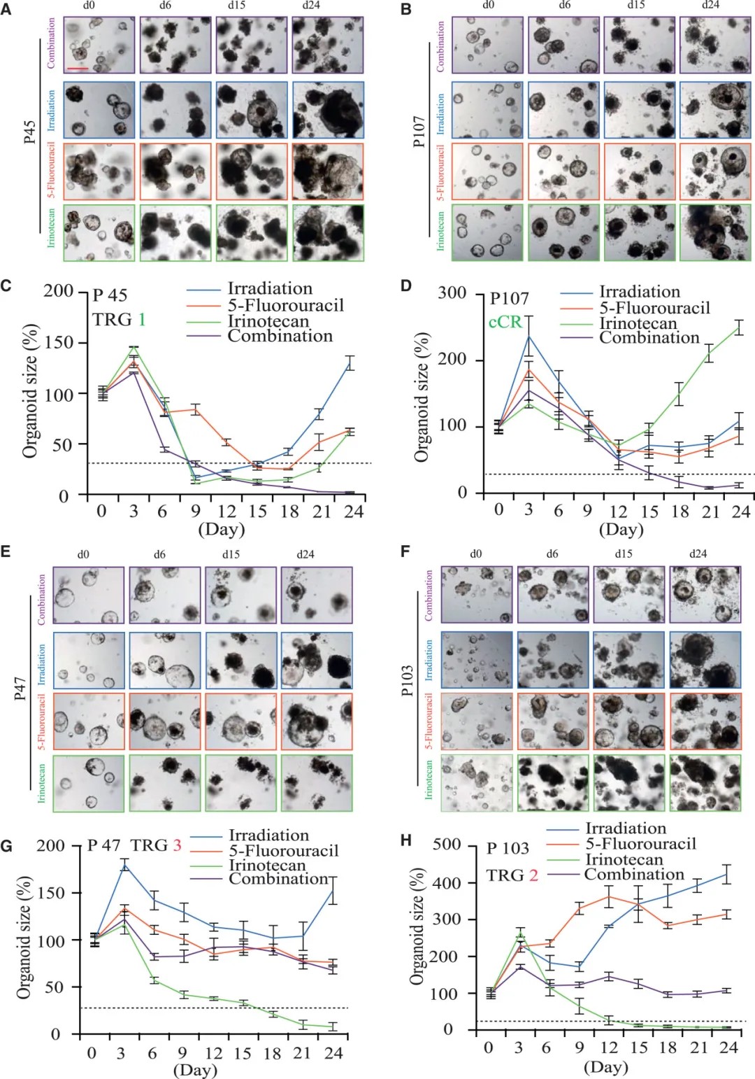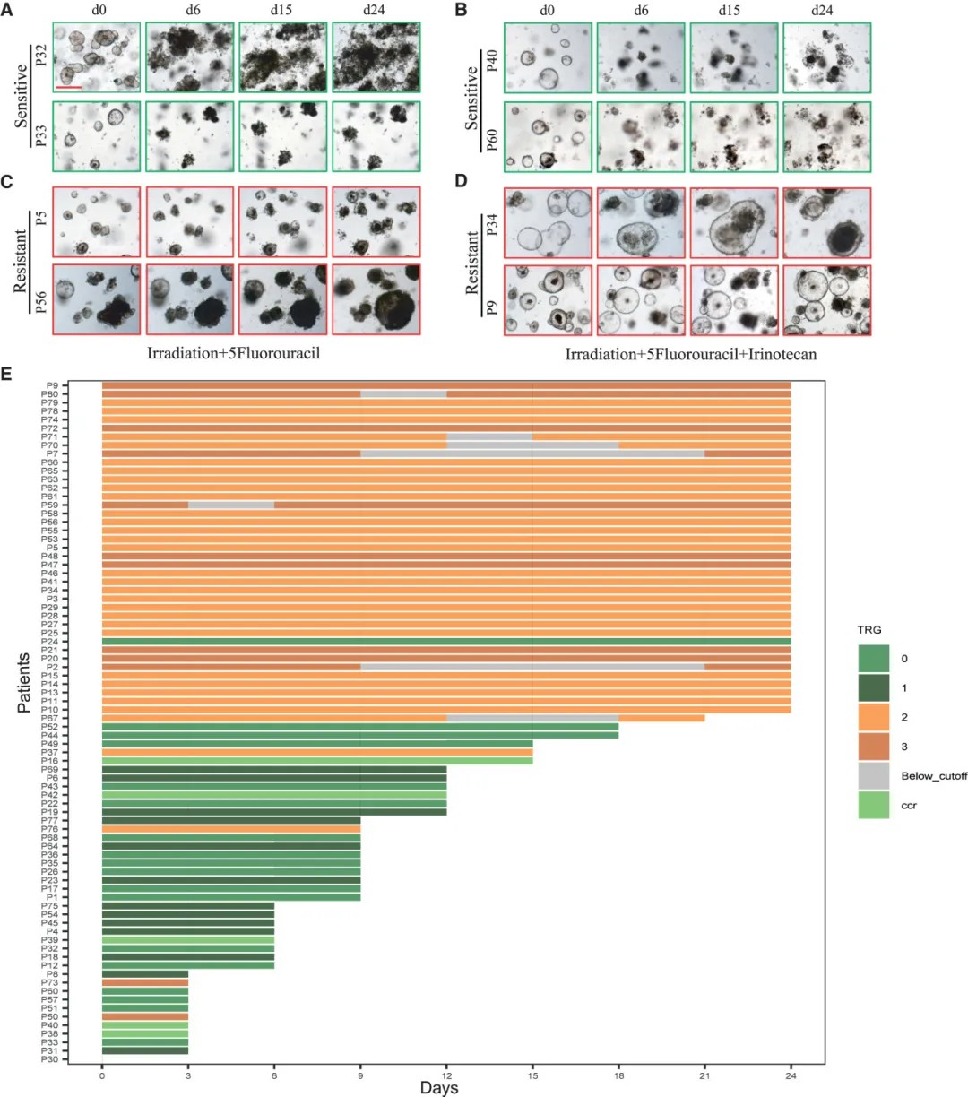 研究团队成功建立了142例直肠癌类器官系(成功率87.12%),并纳入128例患者进行联合放化疗反应测试。结果显示: