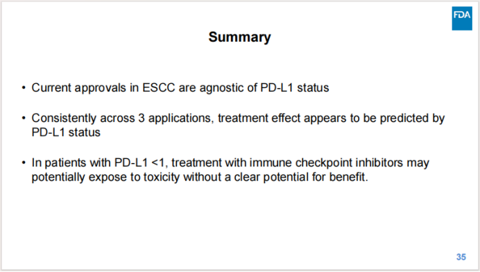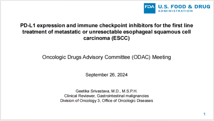 2024年9月,在美国食品药品管理局(FDA)的肿瘤药物咨询委员会(ODAC)会议上,讨论了对于不可切除或转移性ESCC患者一线使用抗PD-1抗体治疗时,PD-L1表达水平对其风险效益的影响。会议指出,目前ESCC的治疗批准在先前是不考虑PD-L1状态的,但多项试验显示治疗效果似乎由PD-L1表达水平所影响,在PD-L1≥1的患者中风险效益更显著,而对于PD-L1<1的患者,使用免疫检查点抑制剂可能使其面临毒性风险而无明确的获益潜力。