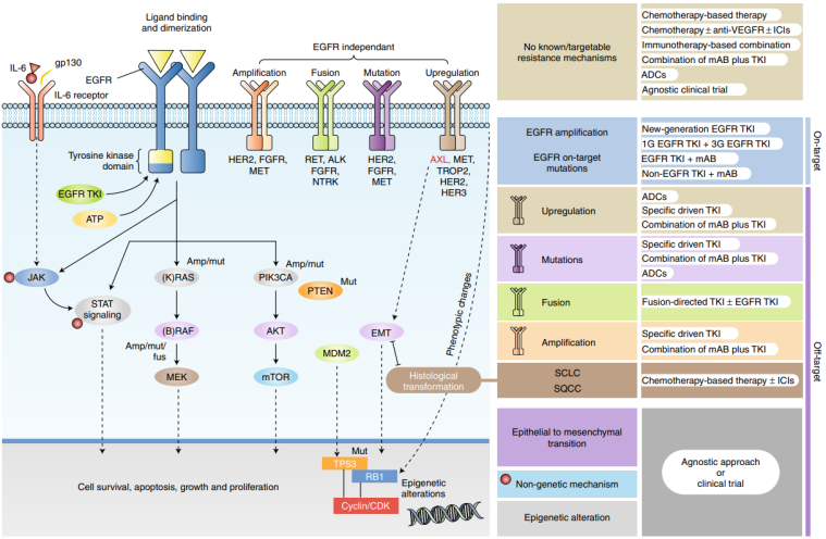 图1. EGFR信号转导通路、获得性耐药机制及相关潜在治疗策略