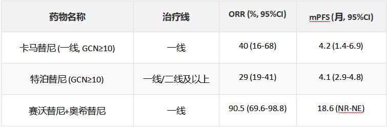 注:ORR为客观缓解率;mPFS为中位无进展生存期;GCN为基因拷贝数;NR为未达到;NE为未评估。
