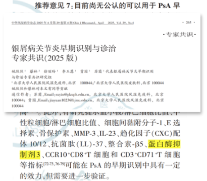 获得临床认可:科研成果的价值最终需要临床实践的检验和认可。2025年,中华医学会风湿病学分会发布的《银屑病关节炎(PsA)早期识别与诊治专家共识(2025版)》中,首次将PI3/Elafin正式纳入PsA的早期识别推荐指标。这标志着该研究成果获得了国内风湿免疫及皮肤病领域顶尖专家的广泛共识,为其临床推广应用提供了权威依据。