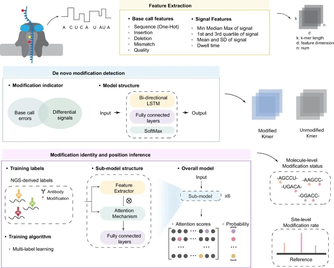 修饰类型与定位:基于注意力机制的多标签神经网络,同时解析kmer内的修饰类型及具体位置。模型训练数据来自天然RNA的分子级特征,保留了真实的表观转录组复杂性。