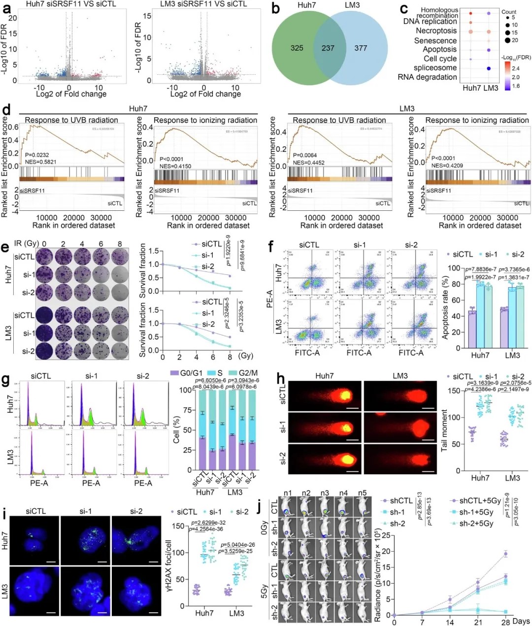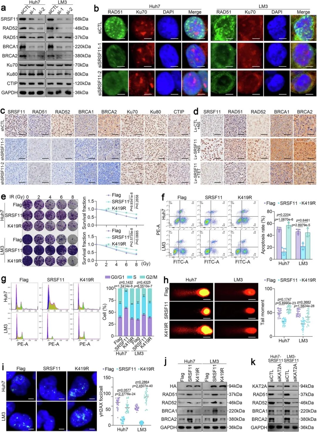 在动物模型中,敲低SRSF11或KAT2A可显著增强肝癌细胞对辐射的敏感性,抑制肿瘤生长。临床队列分析进一步显示,SRSF11高表达与HR通路活性升高、放射抵抗及患者生存期缩短密切相关。该研究提出靶向KAT2A-SRSF11轴可能成为克服HCC放射抵抗的新策略。
