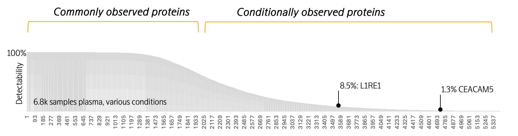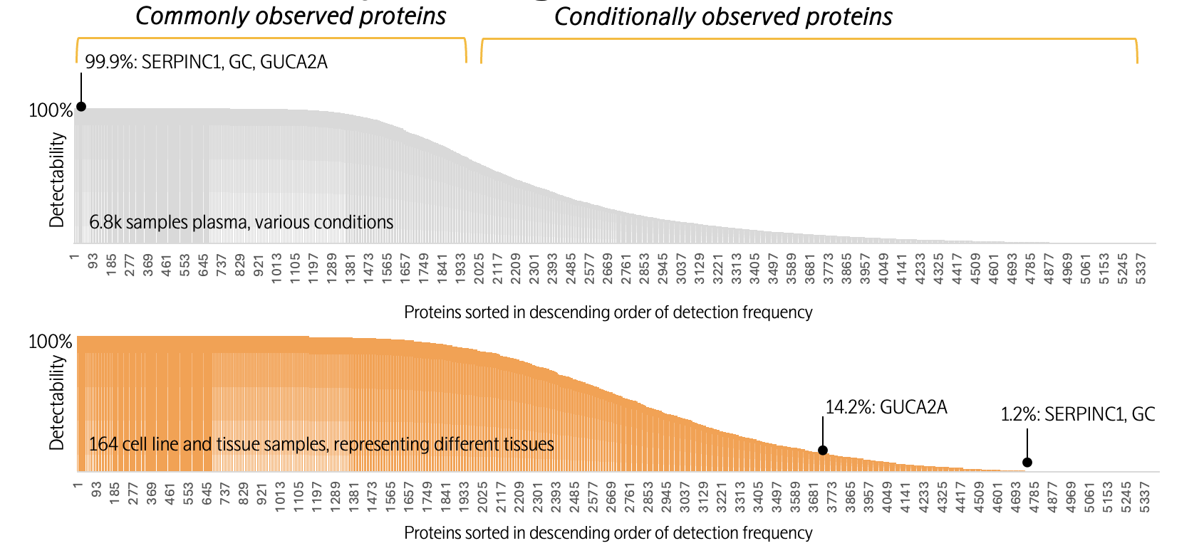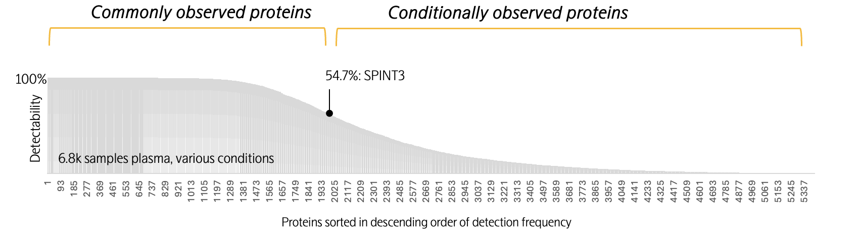 对6,800份泛人群血浆样本(包含随机选择的健康和疾病人群样本)的Olink Explore HT分析数据,绘制出了一幅清晰的蛋白质分布图谱。其核心规律在于:蛋白质的检出并非简单的“全或无”,而是存在“常见性观测蛋白”与“条件性存在蛋白”的不同类别。