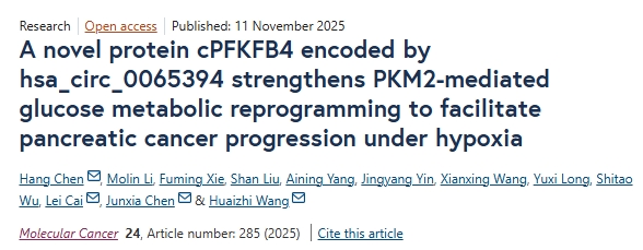 近日,重庆大学附属人民医院/重庆医科大学研究团队合作共同在期刊《Molecular Cancer》上发表了题为“A novel protein cPFKFB4 encoded by hsa_circ_0065394 strengthens PKM2-mediated glucose metabolic reprogramming to facilitate pancreatic cancer progression under hypoxia”的研究论文,本文中,研究人员发现cPFKFB4 蛋白通过调节 PKM2 介导的糖酵解促进缺氧条件下胰腺癌细胞的增殖和转移。本研究结果不仅为缺氧、葡萄糖代谢重编程与胰腺癌之间的相互作用提供了新的视角和有价值的见解,还为胰腺癌的治疗提供了潜在的生物标志物和治疗靶点。