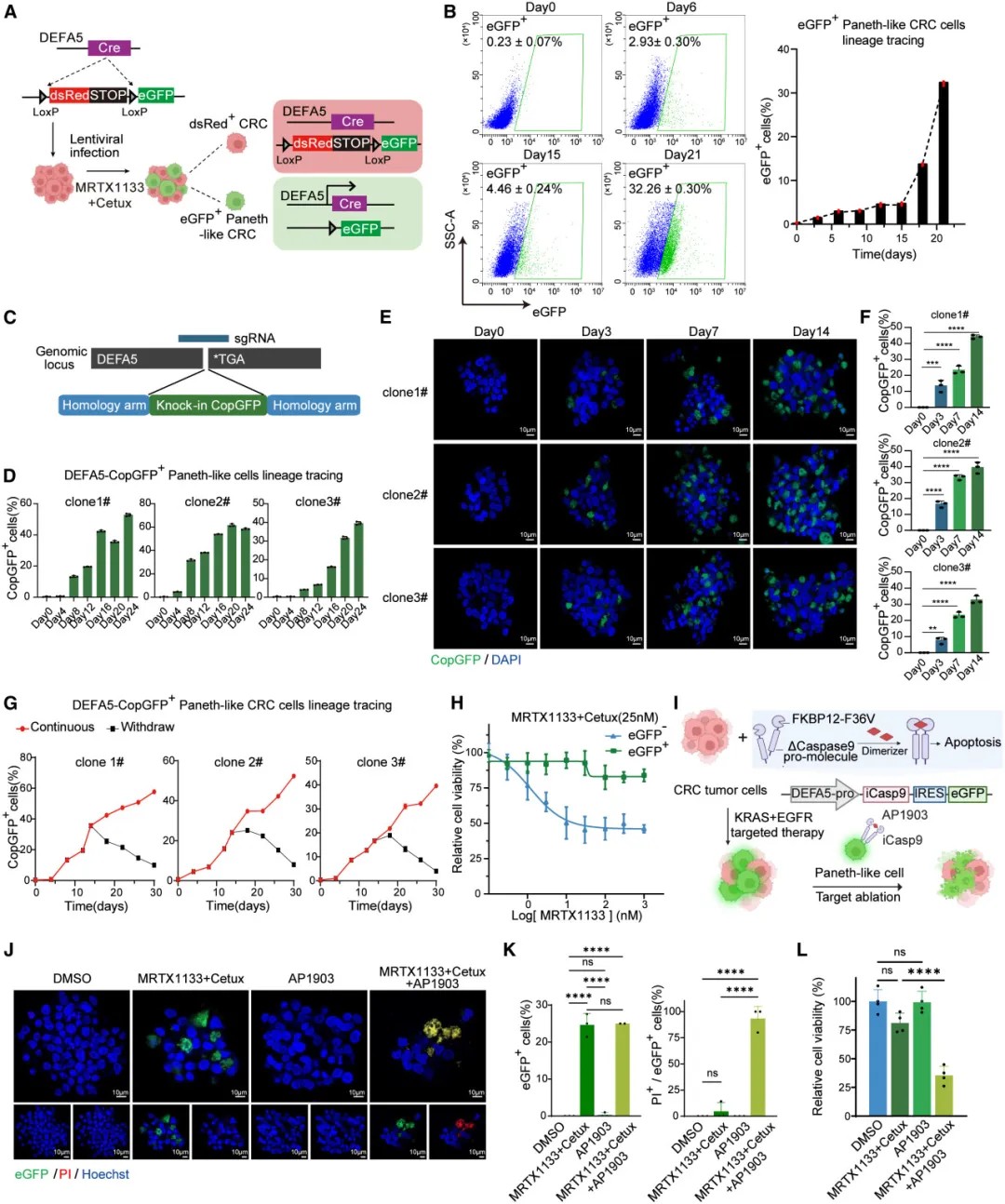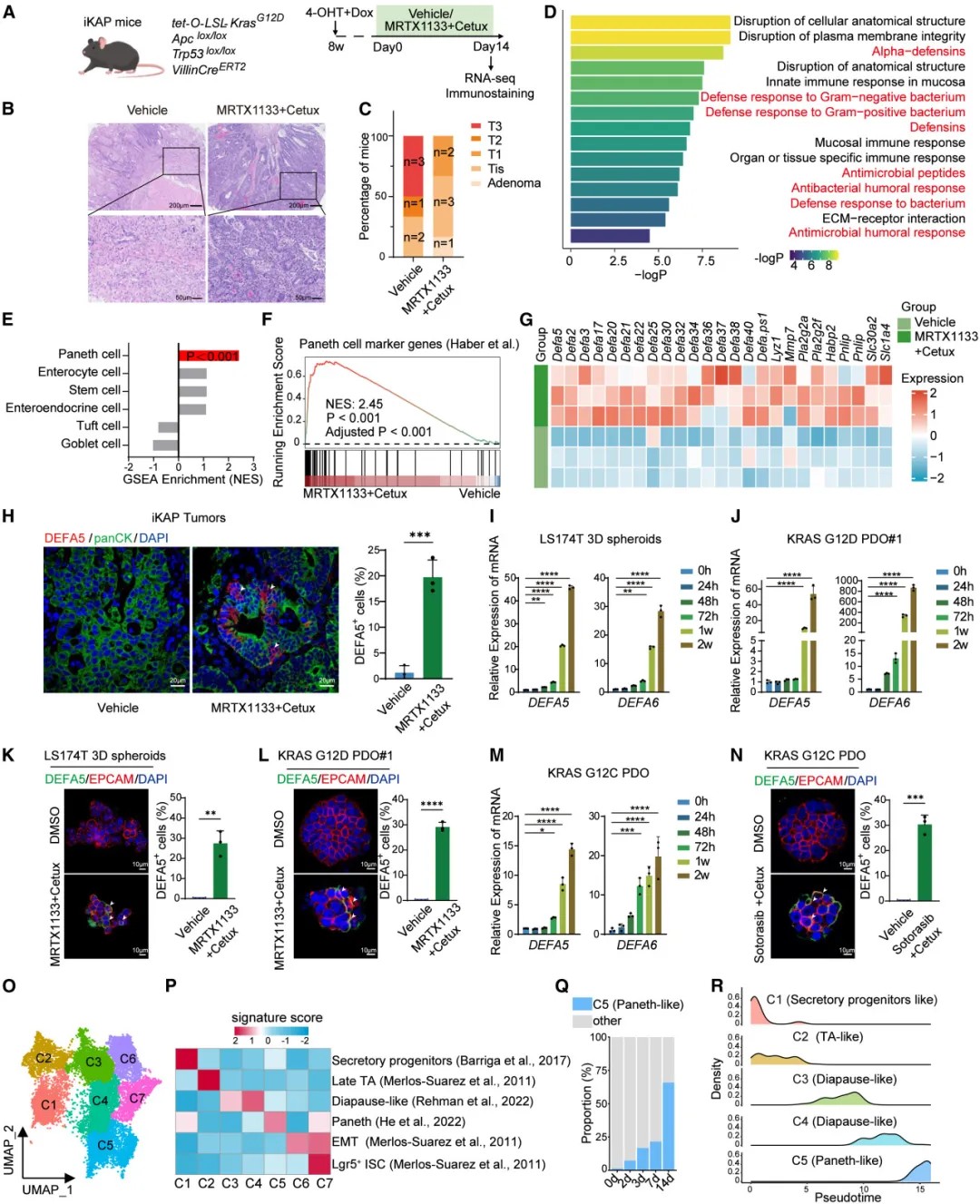 为了深入研究耐药机制,研究团队利用了基因工程小鼠模型、患者来源的类器官和移植瘤模型以及临床标本开展研究。一组实验发现,当KRAS和EGFR同时被抑制后,存活的结直肠癌细胞获得了一种潘氏样细胞状态。