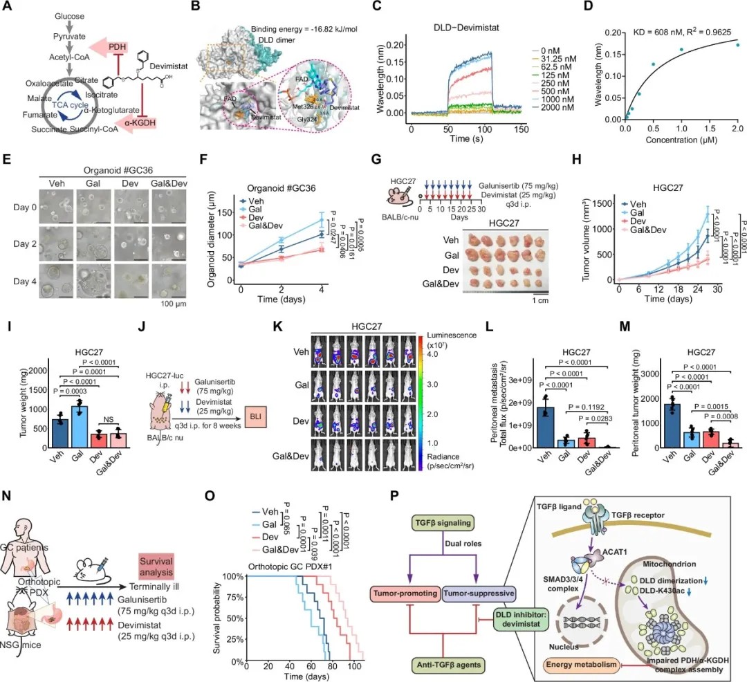 研究人员使用了devimistat,一种脂酸类似物,可有效抑制PDH和α-KGDH复合物的活性。实验表明,devimistat能够与DLD直接结合。在体外实验中,devimistat有效抵消了galunisertib(TβR1抑制剂)对胃癌细胞生长的促进作用。更为重要的是,在胃癌原位PDX模型中,galunisertib和devimistat联合治疗显著抑制了肿瘤生长,并实现了肿瘤消退。