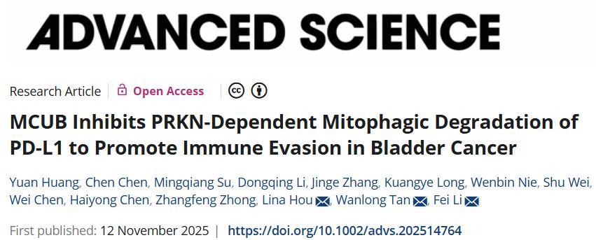 近日,南方医科大学南方医院研究团队在期刊《Advanced Science》上发表了研究论文,题为“MCUB Inhibits PRKN-Dependent Mitophagic Degradation of PD-L1 to Promote Immune Evasion in Bladder Cancer”,该研究中,研究人员对MCUB在肌层浸润性膀胱癌(MIBC)免疫逃逸中的作用进行了探究。通过总体 RNA 测序、单细胞 RNA 测序和蛋白质组学分析发现,从正常组织到 MIBC 组织,MCUB 的表达呈逐渐上升趋势,并且 MCUB 表达与 PD-L1/PD-1 信号通路以及不良预后之间存在显著的正相关关系。空间转录组学和临床组织染色证实了 MCUB 与 PD-L1 的空间共定位。功能实验表明,MCUB 通过抑制 PRKN 依赖性线粒体自噬来减少 PD-L1 蛋白的溶酶体降解,从而稳定 PD-L1 蛋白。这项研究确定了 MCUB-PRKN-PD-L1 轴是 MIBC 免疫逃逸的一个新驱动因素,并提出靶向 MCUB-PRKN 相互作用可能是一种精确的治疗策略,以克服免疫耐药性,同时对正常组织的毒性最小。