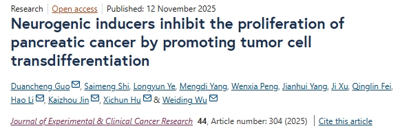 近日,复旦大学附属肿瘤医院/复旦大学上海医学院/华东理工大学研究团队合作共同在期刊《Journal of Experimental & Clinical Cancer Research》上发表了研究论文,题为“Neurogenic inducers inhibit the proliferation of pancreatic cancer by promoting tumor cell transdifferentiation”,本研究结果表明,通过激活 NeuroD1 或药物诱导,胰腺癌细胞能够被诱导发生转分化,这揭示了一种潜在的治疗策略,即通过将肿瘤细胞重新编程为侵袭性较低的状态来减轻恶性程度。