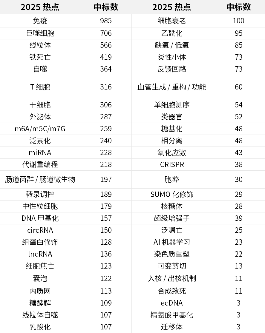 我们收集了2025中标国自然名单,总结了2025年国自然中标TOP 50高频热点,排在前三依旧是熟悉的面孔:免疫、巨噬细胞和线粒体,希望能对大家准备2026年国自然标书有所帮助。