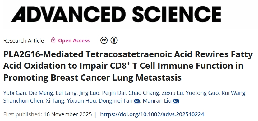 11月16日,重庆医科大学研究团队在期刊《Advanced Science》上发表了研究论文,题为“PLA2G16-Mediated Tetracosatetraenoic Acid Rewires Fatty Acid Oxidation to Impair CD8+ T Cell Immune Function in Promoting Breast Cancer Lung Metastasis”,本研究证明肿瘤相关 PLA2G16通过促进肺部早期转移微环境中二十四碳四烯酸(C24:4(n-6))的积累并损害肺部 CD8+T 细胞的免疫功能,在免疫依赖模式下成为三阴性乳腺癌(TNBC)肺转移的重要促成因素。研究结果表明,PLA2G16 介导的肺部 C24:4(n-6)积累对 CD8+T 细胞的抗肿瘤活性构成代谢障碍,并突显了 PLA2G16 在促进 TNBC 肺转移中的关键作用。以 PLA2G16 为靶点并联合抗 PD-1 基础的免疫疗法可能是临床肿瘤免疫治疗的有效策略。