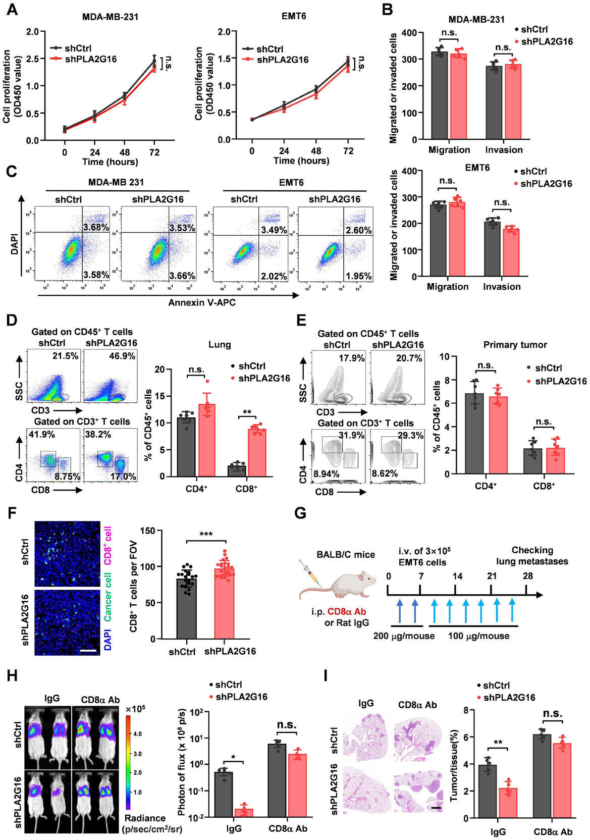 为了探究肿瘤型 PLA2G16 如何调节肺转移,研究人员研究了 PLA2G16 对亲代肿瘤细胞内在恶性特征的影响。研究人员发现 PLA2G16 能够影响免疫功能正常的 BALB/c 小鼠中三阴性乳腺癌(TNBC)的肺转移,这强烈表明 PLA2G16 在 TNBC 中的促转移作用与肺转移微环境中 T 淋巴细胞的功能障碍有关。
