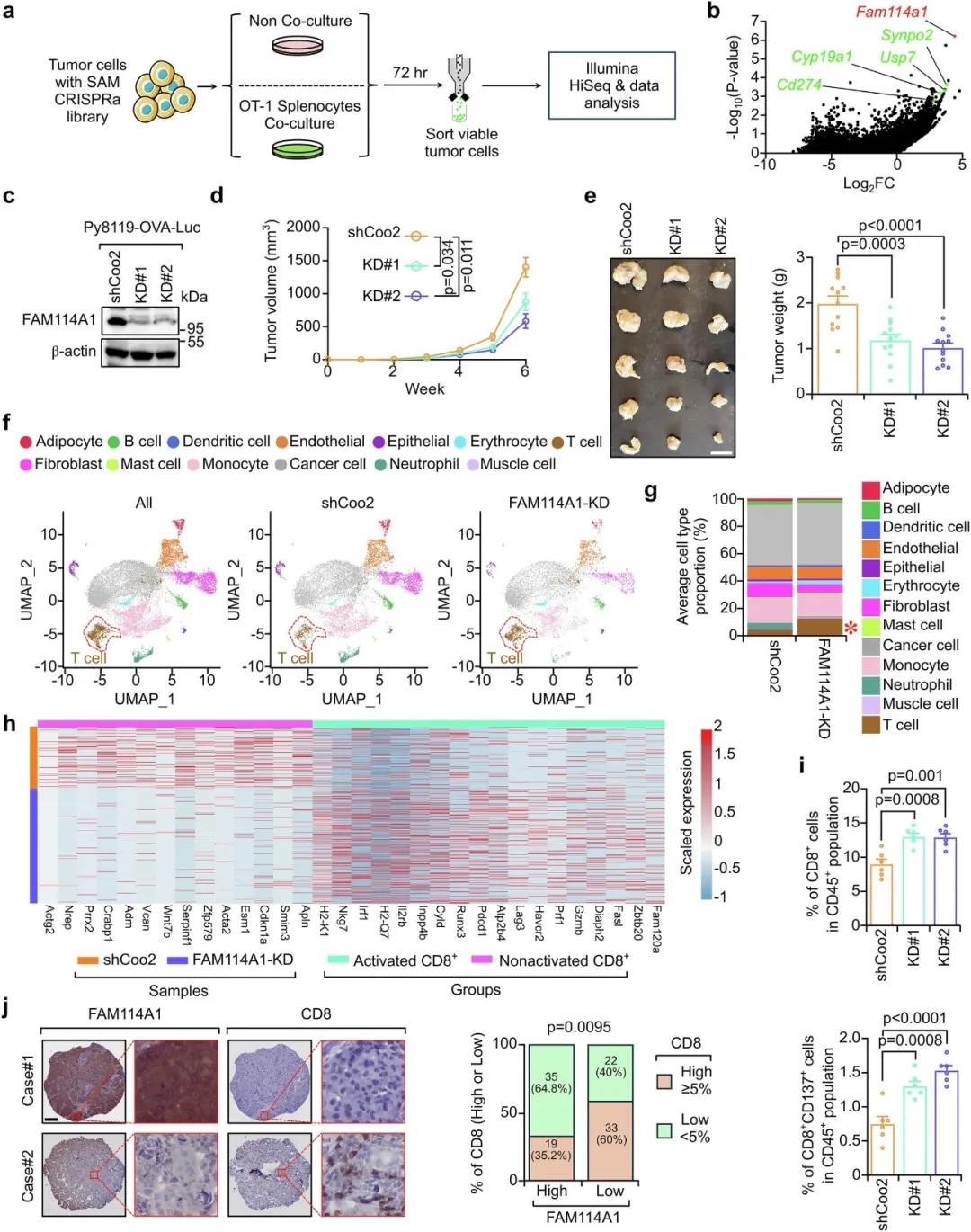 FAM114A1基因在筛选中显著富集,表明其过度表达可能与免疫逃避密切相关。为进一步验证这一发现,研究人员在三阴性乳腺癌小鼠模型中降低FAM114A1表达,结果发现肿瘤生长受到显著抑制,肿瘤内CD8+ T细胞浸润和活化程度明显增加。对109例三阴性乳腺癌患者样本的分析进一步证实,FAM114A1高表达与CD8+ T细胞浸润减少显著相关,支持了其在调节抗肿瘤免疫中的关键作用。