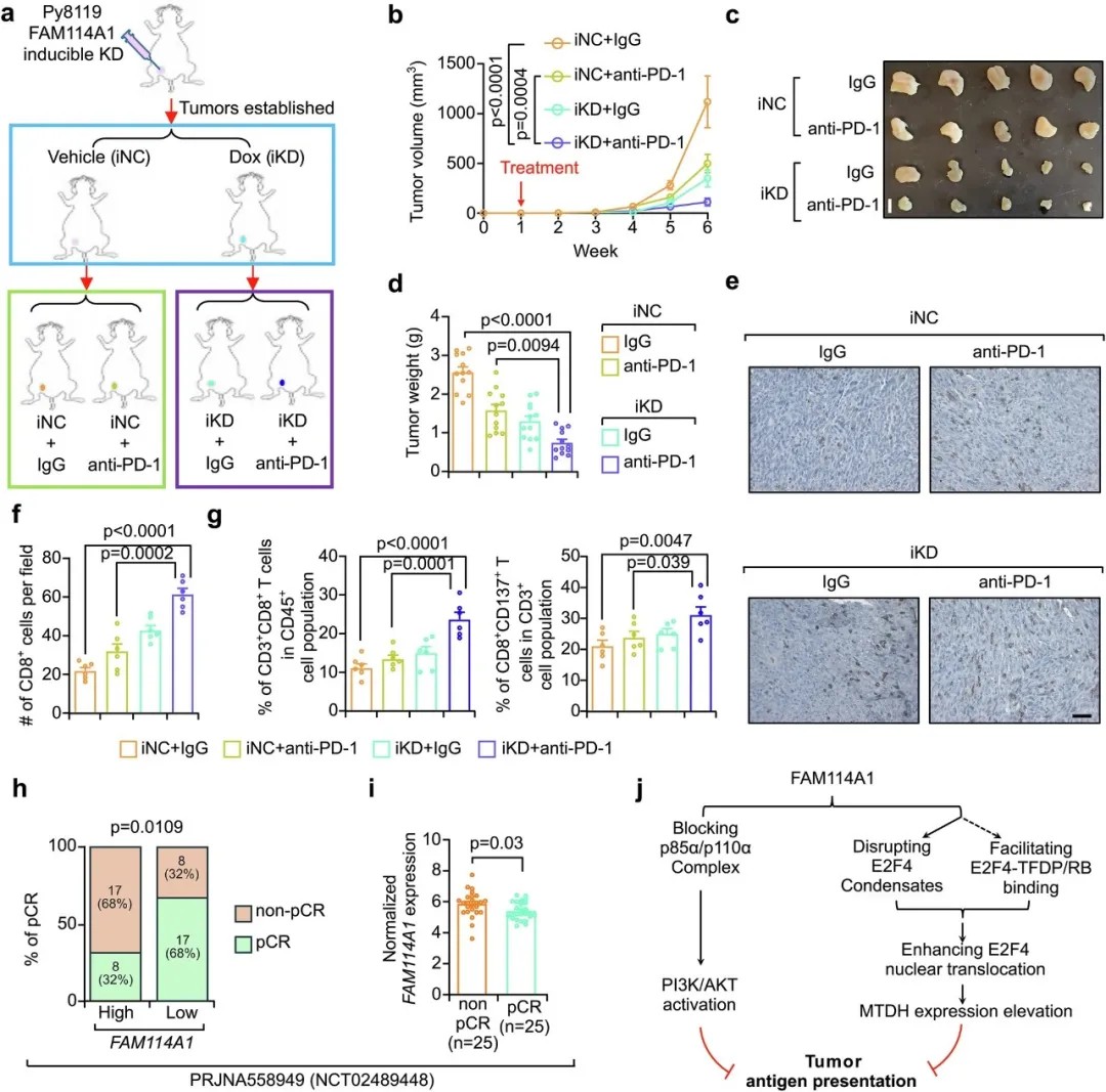 研究发现,靶向FAM114A1可显著提高免疫治疗效果。在动物模型中,诱导FAM114A1基因敲除并结合抗PD-1治疗,显著抑制了肿瘤生长,增加了肿瘤内CD8+ T细胞的浸润和活化。对临床数据的分析显示,在多个免疫治疗队列中,FAM114A1高表达患者病理完全缓解率较低,而FAM114A1低表达患者对免疫治疗的反应更好。