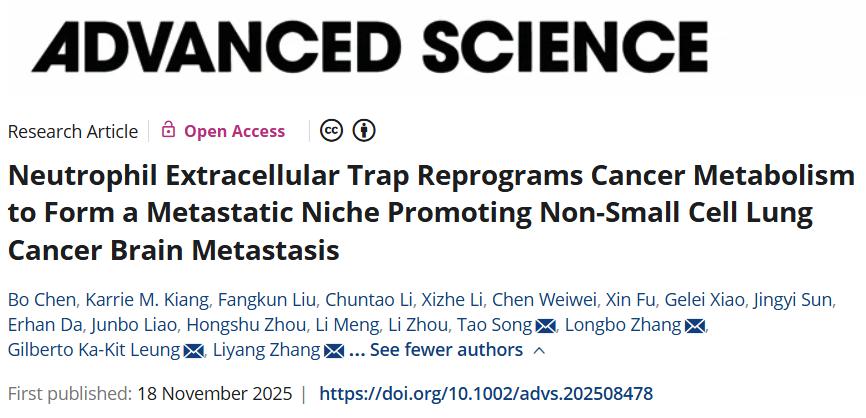 11月18日,中南大学湘雅医院/香港大学研究团队合作共同在期刊《Advanced Science》上发表了研究论文,题为“Neutrophil Extracellular Trap Reprograms Cancer Metabolism to Form a Metastatic Niche Promoting Non-Small Cell Lung Cancer Brain Metastasis”,本研究通过整合空间转录组学、代谢组学、单细胞 RNA 测序、总体蛋白质组学和代谢组学的多组学测序,对来自湘雅医院非小细胞肺癌(XY-NSCLC)队列和玛丽医院非小细胞肺癌(QMH-NSCLC)队列的 34 名患有或未患有脑转移(BMs)的非小细胞肺癌(NSCLC)患者的肿瘤和血液样本进行了分析。通过利用人工智能驱动的预测模型以及体外/体内检测,脂肪酸合成酶抑制剂 TVB-2640 被确定为一种潜在的治疗药物,可破坏代谢脆弱性并抑制非小细胞肺癌脑转移。这些发现为 NET 依赖性细胞相互作用提供了新的见解,这些相互作用维持着非小细胞肺癌脑转移的促转移微环境,为开发基于代谢的新型治疗策略以对抗这种致命并发症提供了有力支持。