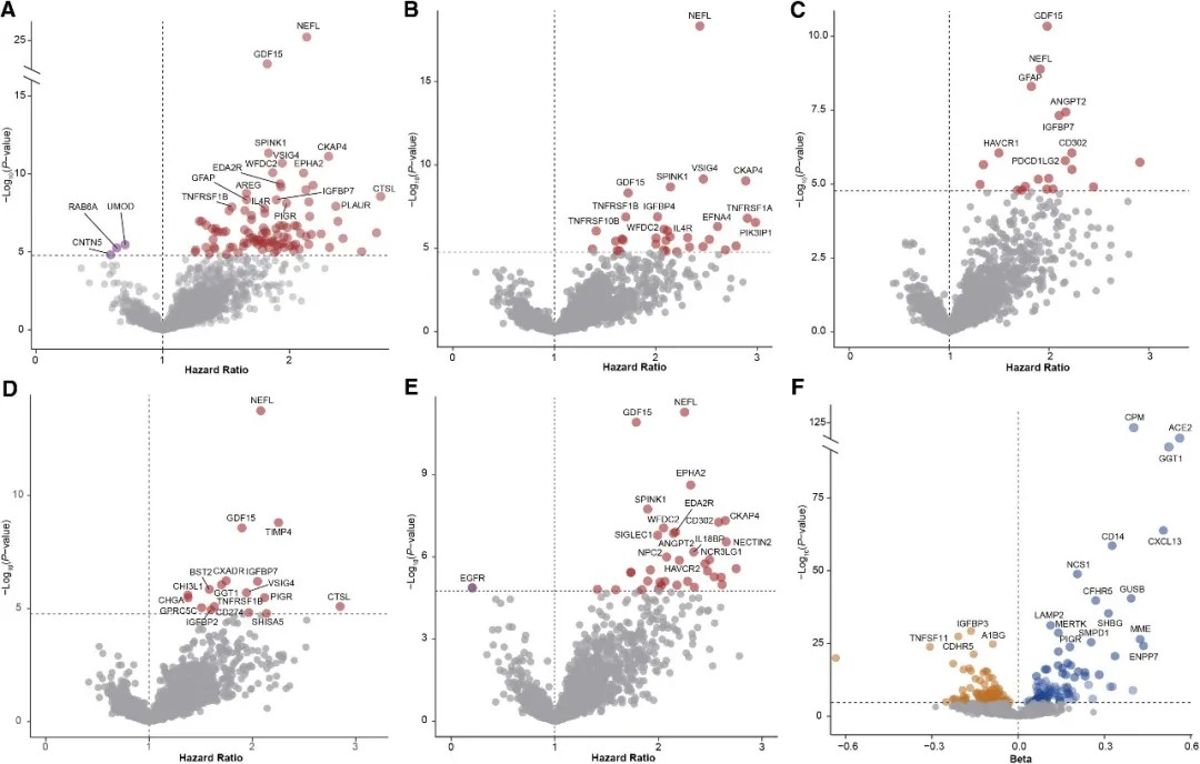 研究人员检测了2,920种血浆蛋白质的水平,并采用Cox比例风险模型分析每种蛋白质与癫痫发病风险的关系。经过多重检验校正后,共发现103种蛋白质与癫痫发病风险显著相关。这些蛋白质中,NEFL(神经丝轻链蛋白)的风险比为2.13,GDF15(生长分化因子15)的风险比为1.82,意味着这些蛋白质水平高的个体发生癫痫的风险增加一倍以上。