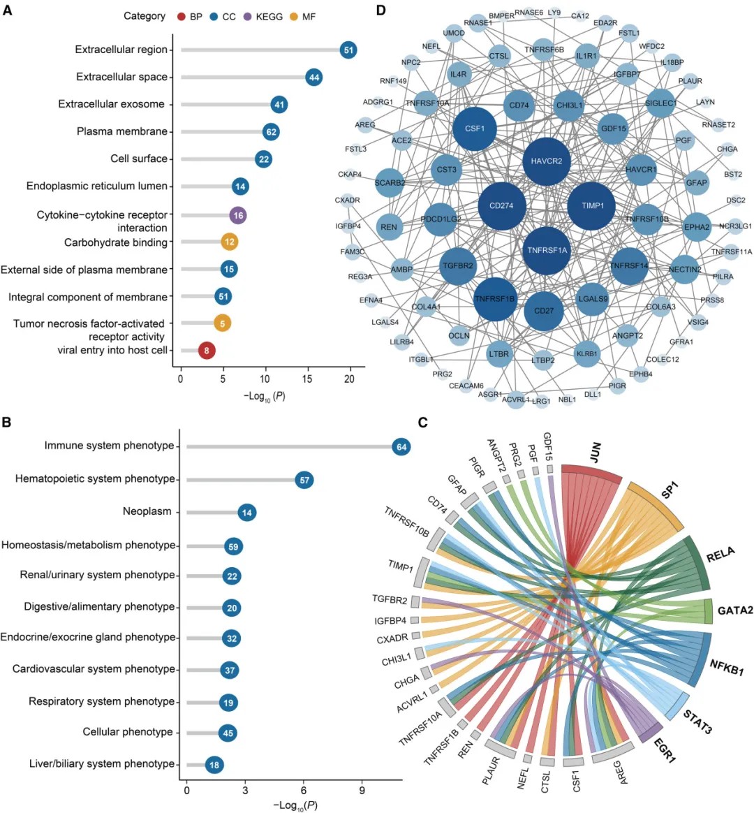 功能富集分析显示,这些癫痫相关蛋白质主要参与免疫反应、细胞因子-细胞因子受体相互作用和信号转导等生物过程。表型富集分析进一步表明,大多数癫痫相关蛋白质显著富集在免疫系统表型中,提示免疫系统在癫痫发病过程中发挥关键作用。