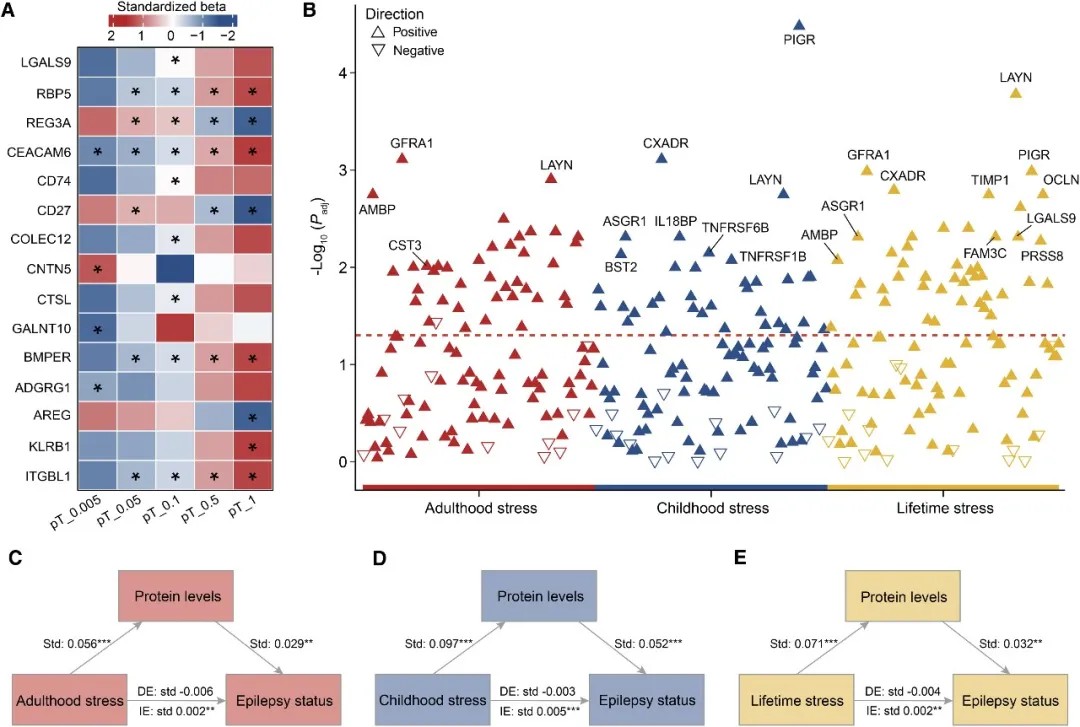 研究还评估了遗传和环境因素对癫痫相关蛋白质的影响。结果显示,应激性生活事件与蛋白质水平的关联比遗传因素更为显著。56种癫痫相关蛋白质与至少一种应激类型显著相关,其中19种蛋白质同时与童年应激、成年应激和终身应激相关。结构方程模型分析表明,多种重要的血浆蛋白质可能部分介导了应激性生活事件对癫痫发病的影响。这一发现支持了环境因素特别是心理压力在癫痫发病中的重要角色。
