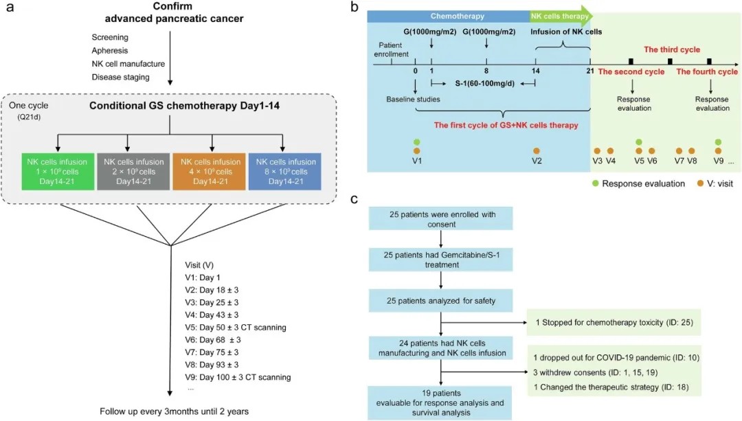 本研究采用单臂、非随机、剂量递增设计,评估了异体NK细胞联合吉西他滨和S-1化疗治疗晚期胰腺癌的安全性和有效性。24名患者接受了不同剂量的NK细胞输注,剂量从1×109到8×109细胞不等。这些NK细胞来源于外周血或脐带血,所有细胞产品均符合预定的释放标准。