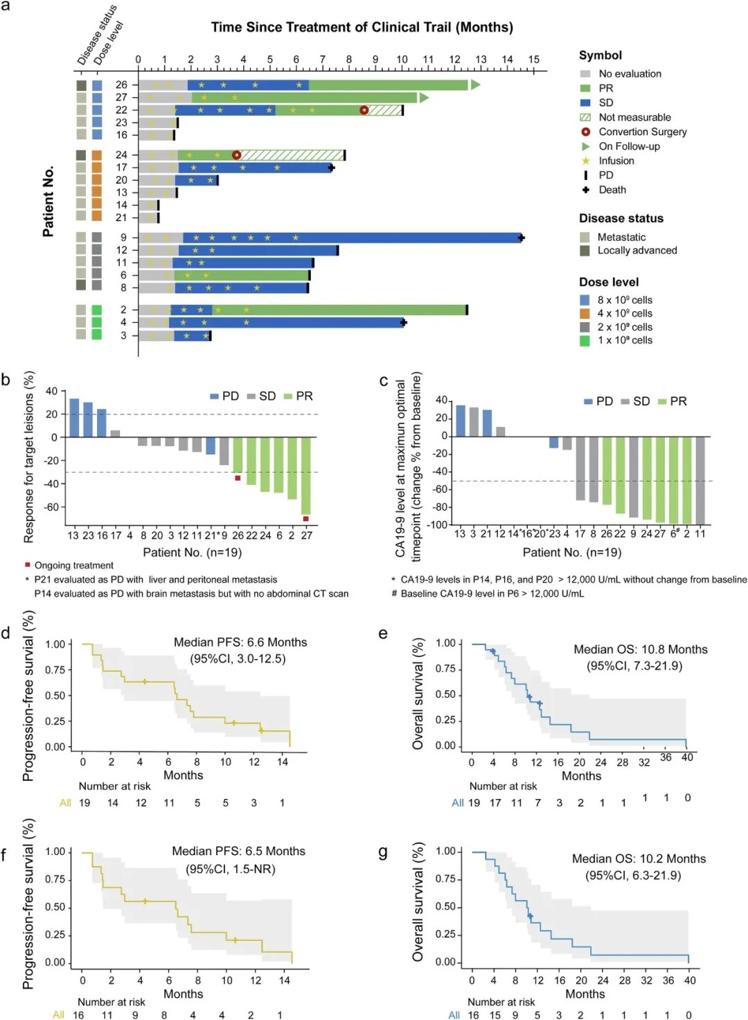 19名患者可进行疗效评估,其中局部晚期和转移性胰腺癌患者分别占16%和84%。大多数患者为男性,中位年龄为64岁,反映了胰腺癌的人口学特征。