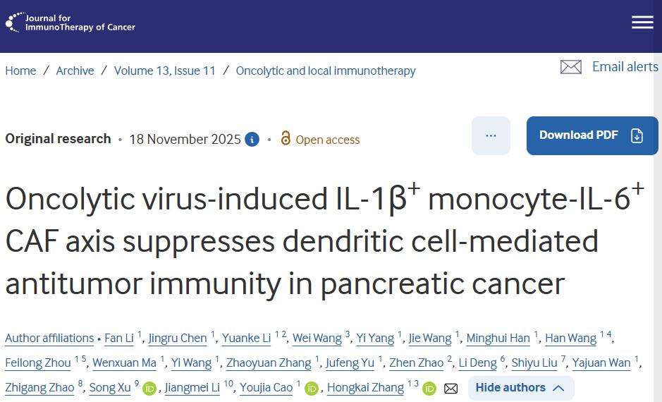 近日,南开大学研究团队在期刊《Journal for ImmunoTherapy of Cancer》上发表了研究论文,题为“Oncolytic virus-induced IL-1β+ monocyte-IL-6+ CAF axis suppresses dendritic cell-mediated antitumor immunity in pancreatic cancer”,本研究揭示了一种此前未被认识到的单核细胞 - 癌相关成纤维细胞 - 树突状细胞轴,该轴通过白细胞介素 - 1β 和白细胞介素 - 6 驱动的树突状细胞功能抑制介导了胰腺导管腺癌对溶瘤病毒治疗的抵抗。这项研究提供了一种机制明确且具有转化前景的方法,以克服基质免疫抑制,恢复有效的抗肿瘤免疫,并改善胰腺导管腺癌患者的治疗效果。