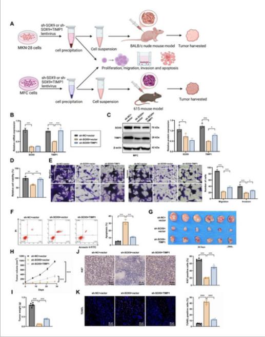 研究人员研究了 SOX9/TIMP1 轴在胃癌细胞生物学功能及其体内致瘤性中的作用。