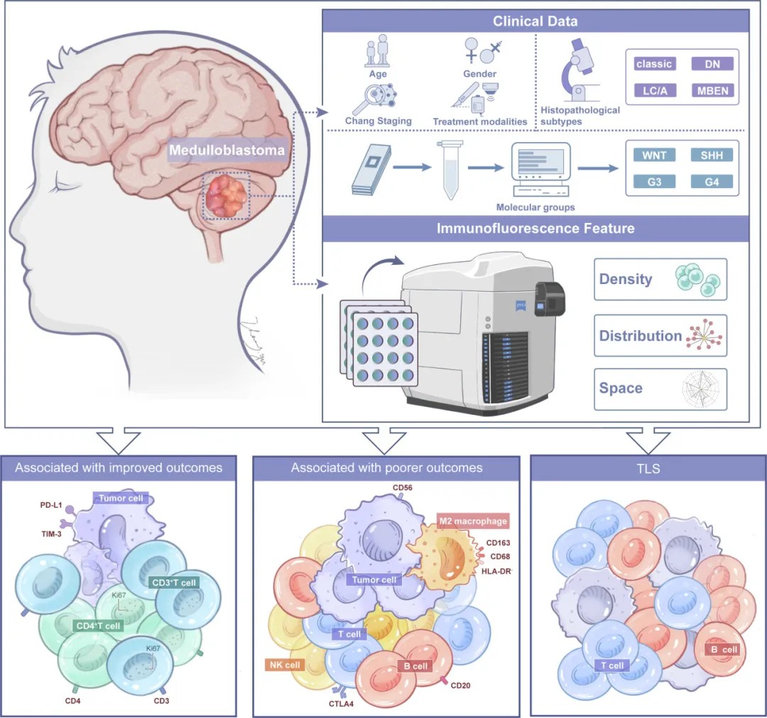 传统上,脑组织被视为免疫豁免器官,血脑屏障限制了免疫细胞的浸润。然而,近年研究发现髓母细胞瘤中存在免疫细胞浸润,但其组成特征和临床意义尚不明确。
