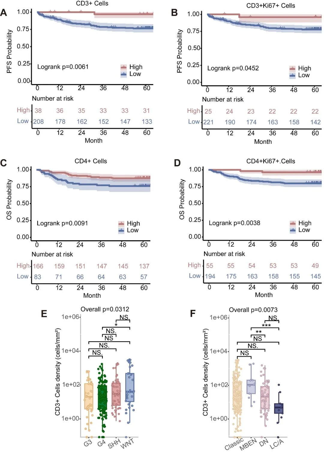 研究发现,不同免疫细胞在髓母细胞瘤微环境中扮演着截然不同的角色。CD4+ T细胞的高密度浸润与改善的总生存期显著相关,风险比为2.19。增殖性CD4+ T细胞也显示出类似的保护作用。