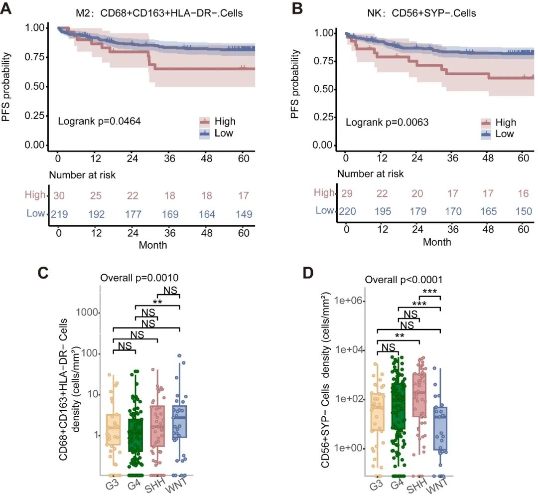 本研究纳入了249例2014年至2020年期间确诊的儿科髓母细胞瘤患者样本,采用六种多重免疫荧光面板对组织微阵列进行分析。这些面板覆盖了T细胞亚群、巨噬细胞、NK细胞、三级淋巴结构和免疫检查点等关键免疫标志物。