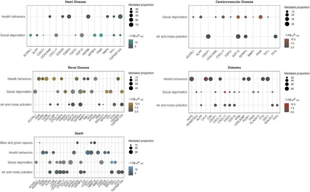 研究人员通过中介分析确定了在环境暴露与疾病关系中起关键桥梁作用的蛋白质。CDCP1、CXCL17、FGF21、GDF15和IGFBP4是社会剥夺和空气噪音污染两种模式共同的关键中介蛋白。GDF15是社会剥夺和空气噪音污染模式与心脏病关联中最显著的中介因子。已知GDF15能够抑制胰岛炎症、氧化应激和β细胞凋亡,从而减少糖尿病的发生发展。