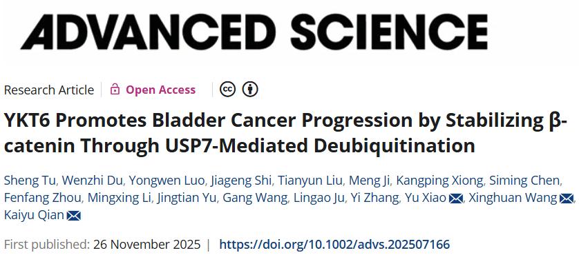 近日,武汉大学中南医院研究团队在期刊《Advanced Science》上发表了研究论文,题为“YKT6 Promotes Bladder Cancer Progression by Stabilizing β-catenin Through USP7-Mediated Deubiquitination”,本研究探讨了 SNARE 蛋白 YKT6 在膀胱癌(BLCA)进展中的致癌作用及其分子机制。转录组学和功能分析表明,YKT6 能促进 BLCA 细胞在体外和体内的增殖、迁移和转移。从机制上讲,YKT6 通过一种新的机制激活 Wnt/β-连环蛋白信号通路,该机制涉及 USP7 介导的β-连环蛋白去泛素化。YKT6 通过招募 USP7 抑制β-连环蛋白的蛋白酶体降解,从而稳定该蛋白并促进其核内积累。这种稳定作用导致致癌靶基因表达增加,并诱导上皮间质转化(EMT)。药理学干预表明,抑制 Wnt 信号可逆转 YKT6 驱动的恶性效应,而激活该通路则可恢复 YKT6 沉默细胞的肿瘤进展。USP7 敲低消除了 YKT6 介导的β-连环蛋白稳定作用,证实了它们的功能相互依赖性。从临床角度来看,YKT6/USP7/β-连环蛋白轴与不良预后密切相关,这为该轴的可成药性提供了概念验证。本研究结果揭示了 YKT6 通过依赖 USP7 的去泛素化作用成为 Wnt 信号通路的新调节因子,为膀胱癌的精准治疗提供了新的见解。