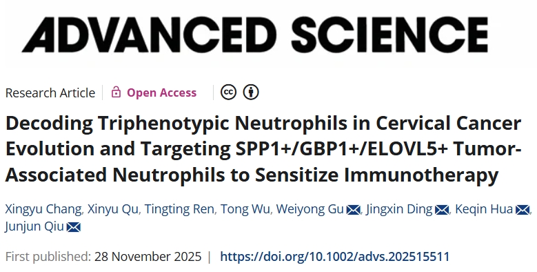 近日,复旦大学附属妇产科医院研究团队在期刊《Advanced Science》上发表了研究论文,题为“Decoding Triphenotypic Neutrophils in Cervical Cancer Evolution and Targeting SPP1+/GBP1+/ELOVL5+ Tumor-Associated Neutrophils to Sensitize Immunotherapy”,在这项研究中,研究人员揭示了宫颈癌(CC)恶性进展过程中三个组织特异性中性粒细胞阶段。1)中性粒细胞水平升高的 CC 患者具有更高的高危病理因素概率。2)发现了 CC 进展过程中的三个组织特异性中性粒细胞阶段,即正常宫颈相关中性粒细胞(NANs)、癌前病变相关中性粒细胞(PANs)和肿瘤相关中性粒细胞(TANs),从肿瘤防御者(NANs)到促发者(PANs),最终成为促进者(TANs),同时强调 TANs 表现出三种恶性生物学活性,包括血管生成、免疫抑制和失调的氧化脂质代谢,以促进恶性进展,这表明 TANs 耗竭与抗 PD1 联合治疗可作为临床干预手段,以增强 CC 免疫治疗的疗效。
