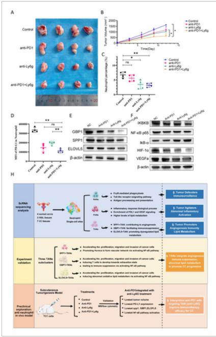 鉴于肿瘤相关中性粒细胞(TANs)在促肿瘤发生中的关键作用,研究人员推测其可能成为治疗靶点。因此,研究人员构建了 C57BL/6 小鼠皮下肿瘤模型,使用小鼠宫颈癌细胞(TC1),以评估抗 Ly6g(抑制小鼠 TANs)治疗的效果。鉴于 TANs 强大的免疫抑制作用,研究人员还尝试将抗 Ly6g 与抗 PD1 治疗相结合。令人瞩目的是,联合治疗组在肿瘤缩小方面效果最佳,表明抗 Ly6g 与抗 PD1 联合治疗能有效提高抗 PD1 单独治疗宫颈癌的效果。此外,联合治疗后中性粒细胞中 SPP1、GBP1、ELOVL5、PD-L1 的表达显著降低,证实联合治疗能有效抑制 TANs。而且,联合治疗对 NF-κB 通路、VEGF/HIF-α 信号通路和 PD-L1 表达的抑制作用也最为显著,从而发挥抗肿瘤作用。总体而言,这些研究结果表明,联合疗法在抗肿瘤效果方面比抗 PD1 单药治疗显示出更优的免疫治疗效果,为临床提供了新的见解。