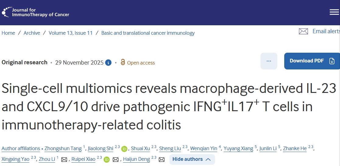 近日,南方医科大学南方医院/南方医科大学珠江医院研究团队合作共同在期刊《Journal for ImmunoTherapy of Cancer》上发表了研究论文,题为“Single-cell multiomics reveals macrophage-derived IL-23 and CXCL9/10 drive pathogenic IFNG+IL17+ T cells in immunotherapy-related colitis”,该研究中,研究人员在人类炎症性肠病结肠炎病变和小鼠模型中,发现了一种具有双重 Th1/Th17 特征、高度克隆扩增且分化轨迹源自组织驻留记忆 T 细胞(TRM)的致病性 IFNG+IL17+CD4+ T 细胞亚群。IL-23 阻断降低了 IFNG+IL17+CD4+ T 细胞的频率,并减轻了结肠炎的严重程度。从机制上讲,IL-23 促进了致病性 Th17(pTh17)前体细胞的扩增和存活,而 CXCL9/10 - CXCR3 信号传导则促进了它们向分泌 IFN-γ 的效应细胞分化。肠道巨噬细胞被确定为 IL-23、CXCL9 和 CXCL10 的主要产生者。巨噬细胞耗竭显著缓解了结肠炎,并减少了致病性 T 细胞。至关重要的是,在结直肠癌免疫治疗应答者中,IFNG+IL17+CD4+ T 细胞与抗肿瘤免疫无关联,表明针对它们的靶向治疗不会影响免疫检查点阻断(ICB)的疗效。