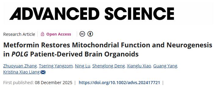 近日,挪威卑尔根大学研究学者在期刊《Advanced Science》上发表了研究论文,题为“Metformin Restores Mitochondrial Function and Neurogenesis in POLG Patient-Derived Brain Organoids”,本研究中,研究人员利用源自患者的诱导多能干细胞(iPSC)构建的皮质类器官被用于模拟 POLG 相关神经退行性疾病,并评估二甲双胍的治疗潜力。单细胞 RNA 测序揭示了多巴胺能、谷氨酸能和γ-氨基丁酸能神经元亚型存在不同的脆弱性,其中多巴胺能神经元表现出最严重的损失和线粒体转录组缺陷。二甲双胍治疗(250 微摩尔,2 个月)显著恢复了神经元身份、亚型特异性基因表达和线粒体功能。这些发现共同表明,二甲双胍能够增强多种神经元亚型的线粒体完整性和神经功能,并为二甲双胍作为治疗 POLG 相关疾病的一种潜在疗法提供了机制上的见解。