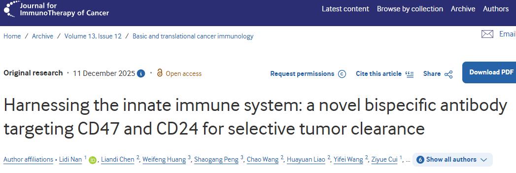 近日,中国药科大学等研究团队在期刊《Journal for ImmunoTherapy of Cancer》上发表了研究论文,题为“Harnessing the innate immune system: a novel bispecific antibody targeting CD47 and CD24 for selective tumor clearance”,本研究中,靶向CD47 的 VHH 片段和一种全人源抗 CD24 抗体被鉴定出来,均表现出强大的配体阻断活性。基于人 IgG1 框架构建的双特异性抗体 BiAb-103C 对 CD47+CD24+肿瘤细胞具有很强的结合能力,并能有效抑制 CD47-SIRPα 相互作用。研究人员观察到靶向CD24(而非 CD47)单阳性细胞的 Fc 效应器活性,可促进 CD47+CD24+肿瘤细胞的吞噬作用和抗体依赖性细胞毒性。在小鼠体内,抗体候选物表现出显著的抗肿瘤活性,并且安全性良好。本研究发现了一种抗 CD47/CD24 双特异性抗体,它为解决 CD47 靶向药物在疗效和安全性方面的挑战提供了有前景的治疗策略,为巨噬细胞驱动的癌症免疫疗法提供了见解,并有可能为免疫疗法无反应的患者提供治疗选择。