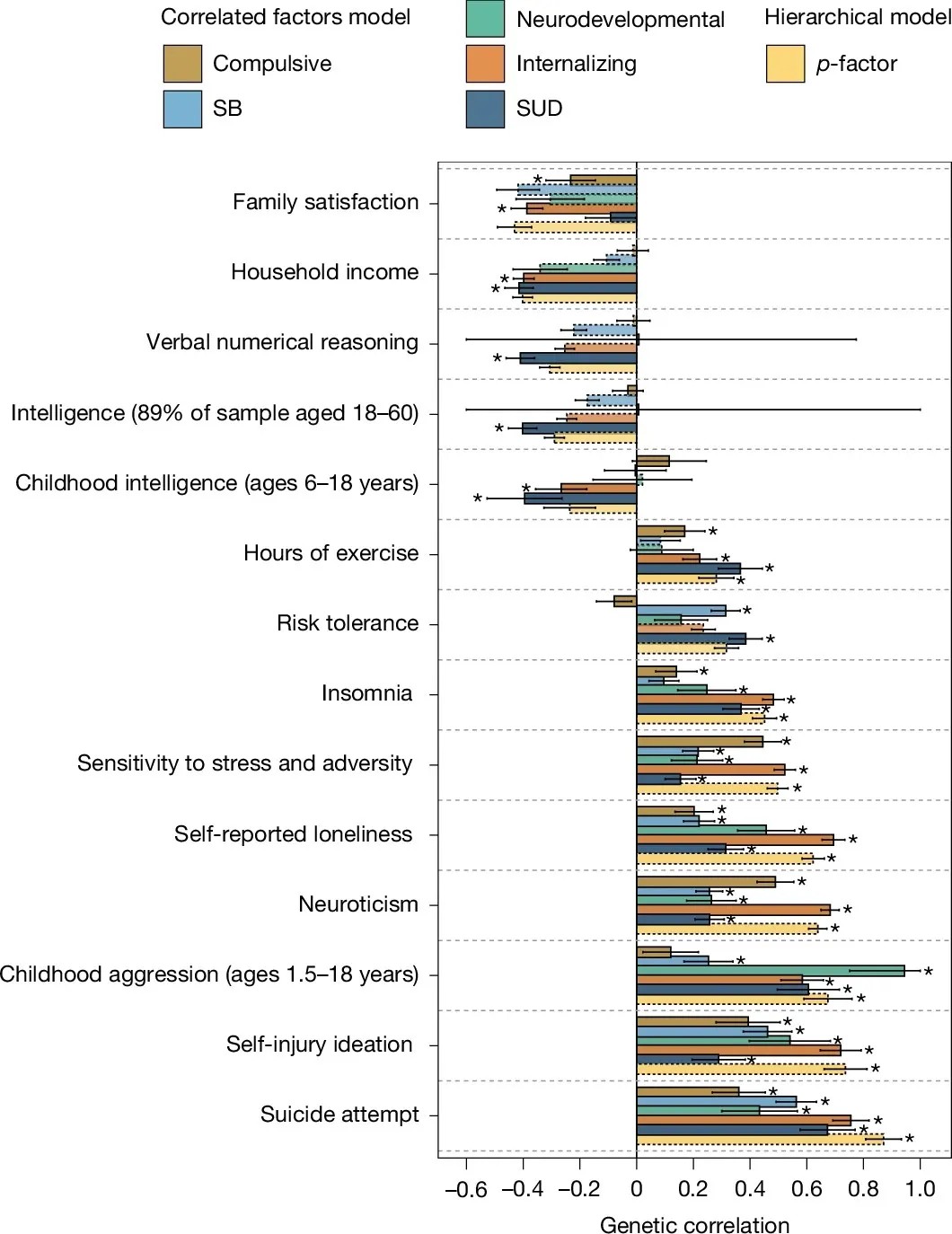 研究团队应用基因组结构方程模型,在主要具有欧洲遗传祖先的数据集中模拟了14种疾病间的遗传重叠。五因子模型被证明最能拟合数据,包括:强迫相关障碍(定义疾病:神经性厌食症、强迫症)、精神分裂-双相情感障碍、神经发育障碍(定义疾病:自闭症谱系障碍、注意缺陷/多动障碍)、内化障碍(定义疾病:创伤后应激障碍、重度抑郁症、焦虑症)和物质使用障碍。