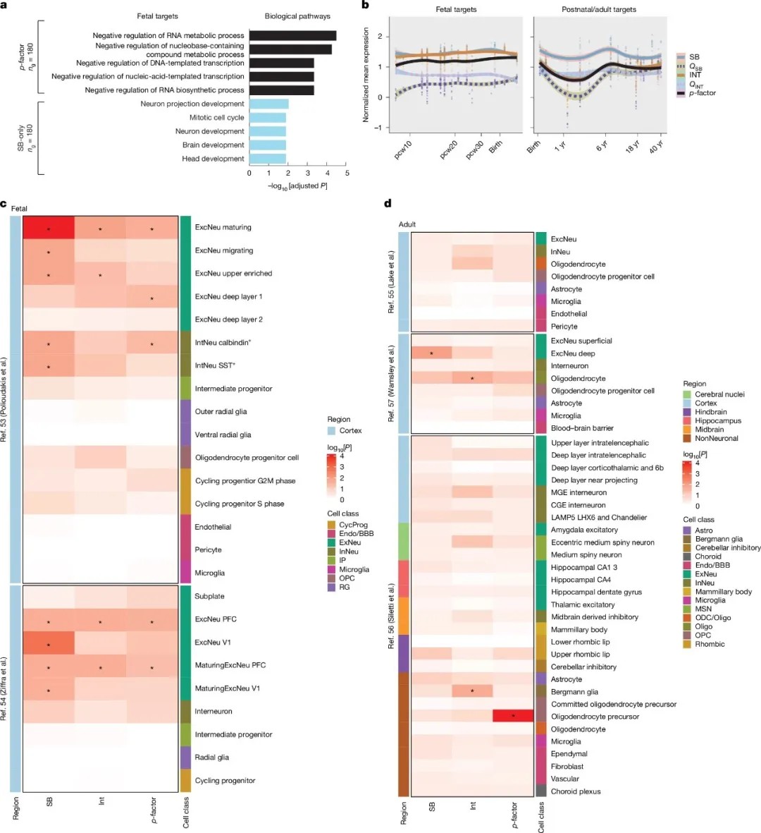 p因子(高阶一般精神病理学因子)的靶基因主要富集于与基因调控相关的广泛生物过程。精神分裂-双相情感障碍因子靶基因则富集于与神经元发育相关的更特异性术语。