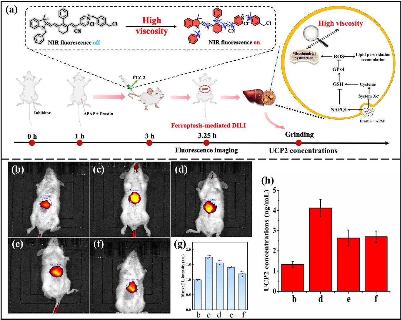 近日,韩国梨花女子大学/山东济南大学研究团队合作共同在期刊《Advanced Science》上发表了研究论文,题为“Investigating Mitochondrial Viscosity in Ferroptosis-Mediated Drug-Induced Liver Injury using a Double-Targeted Strategy”,鉴于线粒体解偶联蛋白 2(UCP2)在肝损伤中高表达,本文提出了一种新的近红外荧光探针(命名为 FTZ-2),通过引入结合静电反应和探针 - 蛋白质对接的线粒体双靶向策略,来探究线粒体粘度与铁死亡介导的药物性肝损伤(DILI)之间的复杂关系。新合成的 FTZ-2 在存在活性物质的情况下对环境粘度具有高度选择性。由于其良好的细胞毒性和线粒体定位特性,FTZ-2 被用于监测铁死亡细胞和铁死亡介导的 DILI 小鼠的粘度变化。荧光信号的减弱表明,铁抑素 -1、谷胱甘肽和 N-乙酰-L-半胱氨酸可以减轻肝损伤。值得注意的是,在铁死亡小鼠和铁死亡介导的 DILI 小鼠的肝脏中也发现了 UCP2 的高表达。综上所述,这项工作展示了一种通过线粒体粘度变化进行肝损伤早期诊断和评估的双靶向策略,并有助于提高肝损伤的治疗效果。