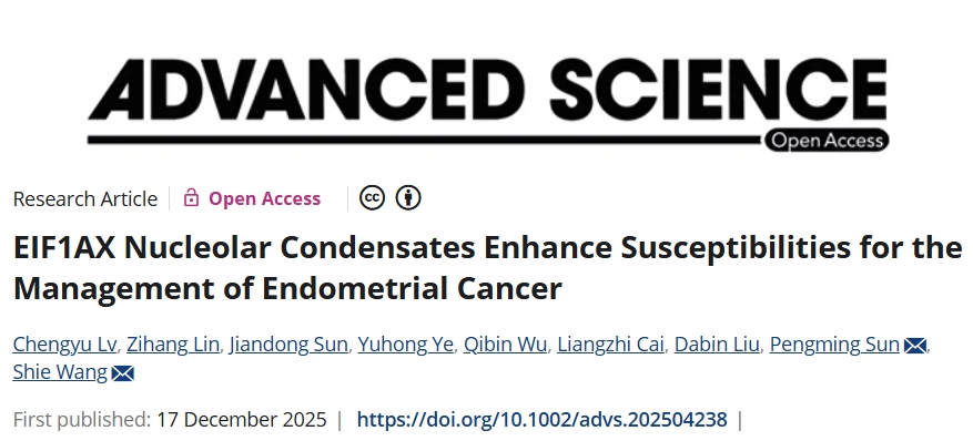 近日,福建省妇幼保健院研究人员在期刊《Advanced Science》上发表了研究论文,题为“EIF1AX Nucleolar Condensates Enhance Susceptibilities for the Management of Endometrial Cancer”,初步研究结果表明,子宫内膜癌中 EIF1AX 的异常亚细胞定位与不良预后显著相关。在本研究中,采用化合物库筛选可诱导子宫内膜癌细胞中 EIF1AX 核定位的治疗剂,随后通过 CRISPR 库筛选来鉴定抗衰老化合物。结果表明,2,5-MeC 和达西诺司他联合使用能有效抑制肿瘤生长。此外,RNA 测序和抗体阵列分析显示,2,5-MeC 和达西诺司他的合成致死性是通过激活 JNK/MAPK 信号通路介导的。总之,这些发现为 TP53 异常的子宫内膜癌提供了一种新的治疗策略。