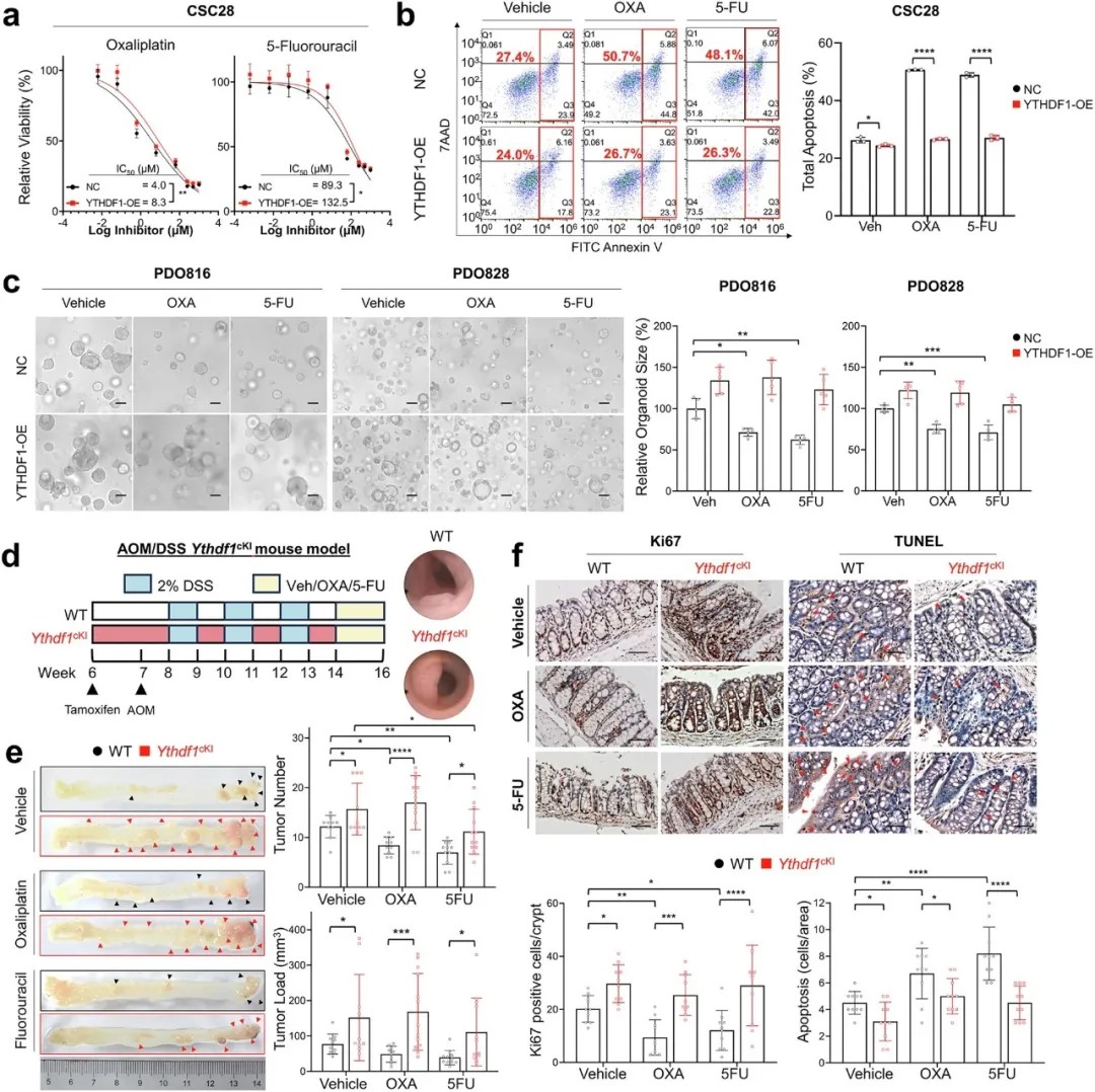Lgr5特异性Ythdf1敲入小鼠的肠道肿瘤数量和负荷显著增加,且对奥沙利铂和5-氟尿嘧啶的敏感性降低;